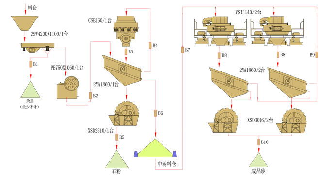 日運轉:9-10小時 進 料:石灰石,尺寸600-1000mm 成 品:20-30mm、10-20mm、5-10mm石子、<=5mm砂子,供應混凝土攪拌站、公路建設等。
